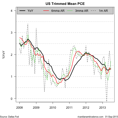 Of course, food and fuel make up an important part of the cost of living, so trimmed mean PCE inflation is probably a better measure. This was also very low, with the 1m AR pace and through the year pace both ~1.4%. The 6mma AR is ~1.3%, and though there are some signs of a pickup from the Q2 low, it’s not yet certain.