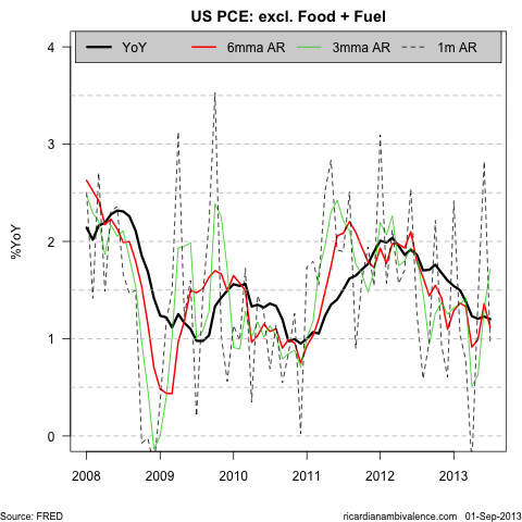 Core PCE inflation rose at an annualised pace of less than 1%y/y in July, and over the year is up only 1.2%. The 6mma AR pace is the best gauge, and this fell 25bps to 1.1%y/y.