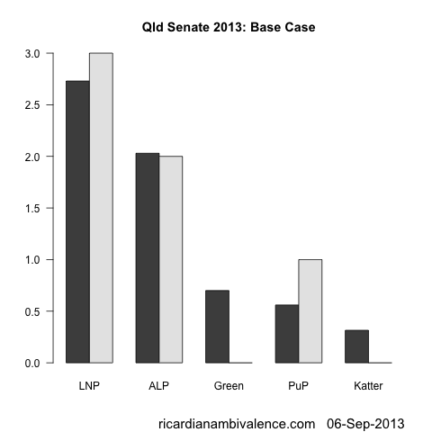 I’ve put what I think is a fair estimate of the 2013 Senate vote below: I’ve assumed that the LNP get 39% of the senate vote (down 2.4% from 2010, as the Katter and Palmer conservative protest parties will hurt them more than the ALP); that the ALP get 29% (down 0.4% from 2010); that the Greens get 10% (down 2.76% from 2010, as Milne is a charisma black hole relative to Bob Brown); that Palmer gets 8%; and that Katter gets 4.5% of the senate vote.
