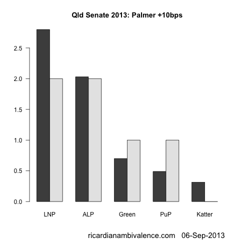 Next say we boost the Palmer United Party (PUP) vote by only 10 votes in each ten thousand (10bps). That is, we trim them off the LNP vote and put it toward the PUPs.