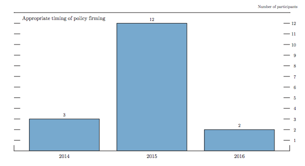 Even with the expected decline of the unemployment rate and increase of inflation, the median voter does not expect to get started with tightening until 2015 – and some think they ought to wait until 2016.