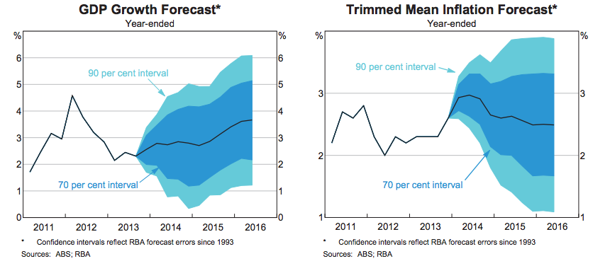 It follows that if AUD goes back up to where it was for the Q4’13 SOMP (AUDUSD 95c & TWI at 72) demand growth will drop back to the softer Q4’13 SOMP forecast; consequently inflation will decline faster, and the RBA’s easing bias may be re-instated.