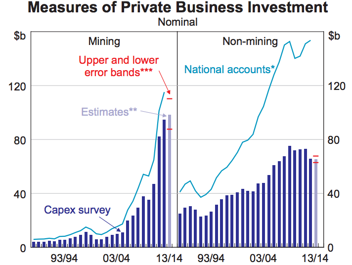 I see the risks around the RBA’s forecasts as to the downside. My judgement is that mining investment will fall away more quickly than the RBA expects, and I doubt that non-mining investment will be able to fill the gap: how could it? Mining capex is going to decline by ~40bn over the next few years, and non-mining is very unlikely to rise by that amount (if it occurred it would be an all time high by a large margin).