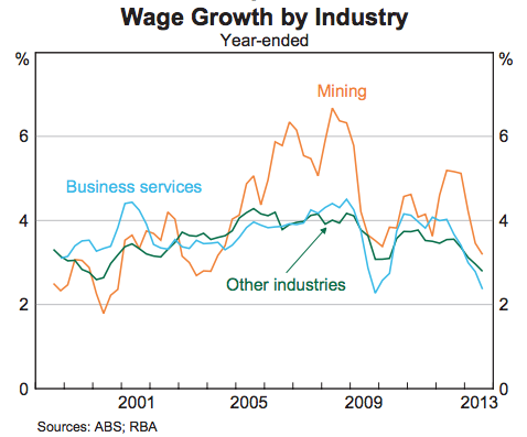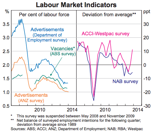 What about inflation? Well like everyone else the RBA is a little confused by the Q4’13 inflation data. They put forth three explanations: faster FX passthrough, noise, and a supply-side collapse. I believe the first and second — it’s hard to square the supply-side story with the soft labour market (note that the RBA was also surprised by the weakness of wag growth).
