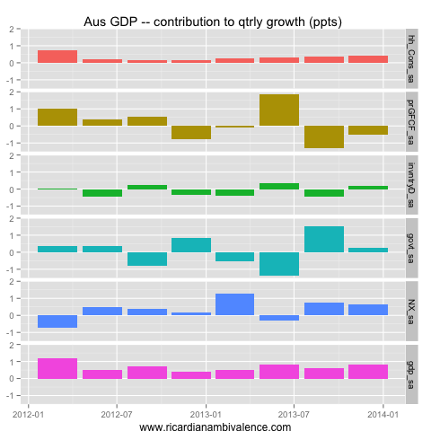 Over the last two quarters, there has been a nice increase in consumption, however this has been offset by slowing investment – and with the outlook for further declines of investment and slower growth in Government spending, consumption will need to keep firm (or net exports will have to keep booming) to keep overall GDP growth around 3%yoy.