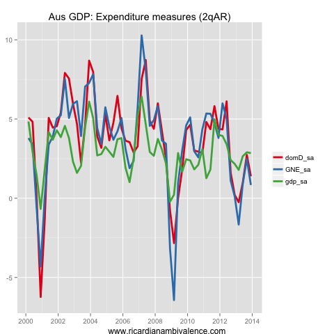 Finally, thinking about policy – with the outlook for further declines in the terms of trade, it’s hard to see nominal GDP (or related measures) holding up. And with the bits of the economy the RBA most directly controls (domestic demand and GNE) still very weak, it’s premature to say anything more than that the data remains consistent with ultra-easy policy.