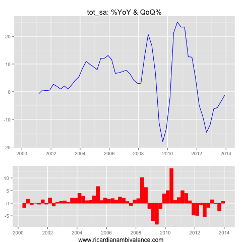 I know a lot of readers are interested in nominal GDP – and here the news is a it better – due to a (probably temporary) rise in the terms of trade. It’s up on the quarter, and down only a small amount on the year (note that the YoY % decline was similar to the GFC).