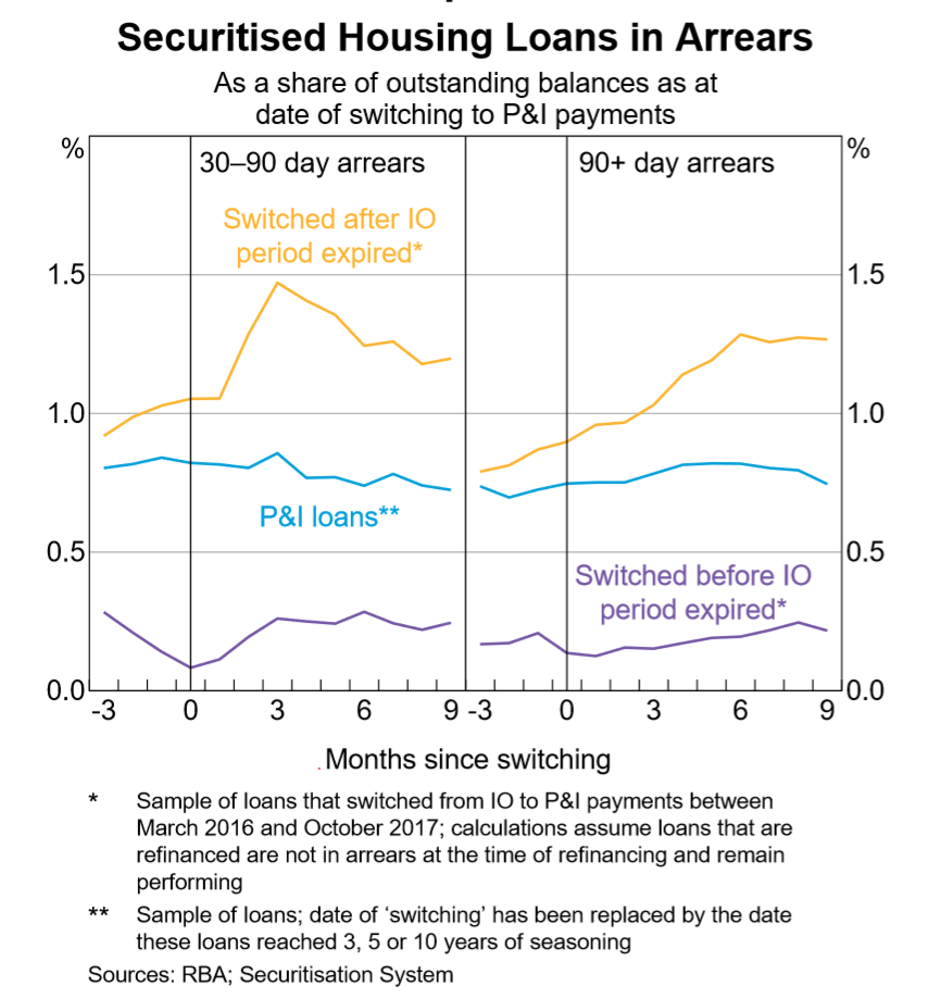 The thing to note about the above chart is that the observation period used to calculate mortgage performance is Mar’16 to Oct’17 — before the tightening of credit conditions that happened in 2018. IO borrowers tend to experience stress when their IO period ends — which suggests that some proportion of IO borrowers are unable to afford a P&I repayment schedule.