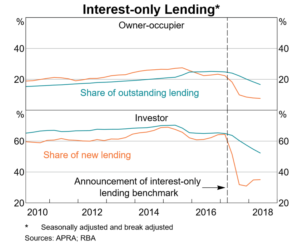 In the five years prior to the introduction of policy measures to slow IO lending, IO loans rose to be ~40% of the flow of new loans — and therefore ~40% of the stock.