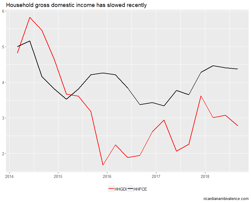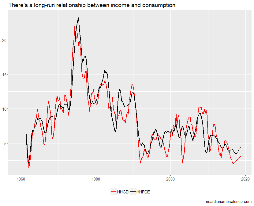 There is a clear long run relationship: so you should not expect household consumption to run too far ahead of income growth over any period of time. The chart below shows the long run relationship between the two series (I use an annual average growth rate to smooth the two series, hence the small difference between the first and second charts).