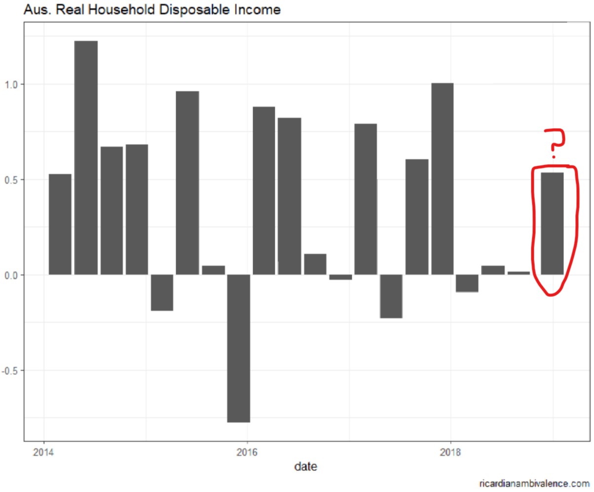 The RBA’s new table of forecasts tells us that they expect 0.5%y/y for Real Household disposable income (note that the above charts have been nominal). That requires 0.5%q/q. That may sound low, but as the prior three quarters have been basically flat, it’ll be the best quarter since Q4’17.
