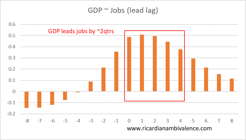 The next chart (below) shows the lead-lag correlations between GDP and Jobs. The higher the number, the greater the correlation. As you can see the great mass of correlation is between concurrent (x axis label = 0) and a one year lead (x-axis label = 4).