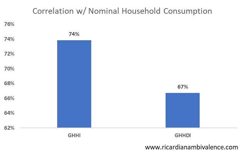 This post raises the additional question of why HHGI would be a better guide to consumption than HHGDI given that consumers only have access to money net of interest receipts & payments and taxes & transfers (which I presume HHGDI accounts for and HHGI does not). Again, it’s a mystery, but it must have something to do with the link between NGDP or HHGI and employment.