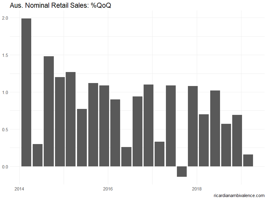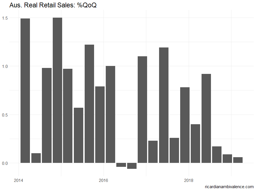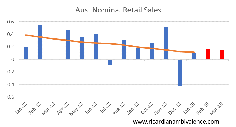 The RBA has been worried about a retail slump — and they have got one. Their is no financial stability reason to resist cutting the cash rate, and on current forecasts they never get (core) inflation back to target.