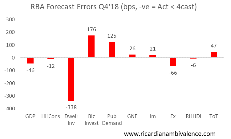 The charts above and below shows what happened v. the RBA’s forecasts. The basic story is that growth was ~50bps weaker than they expected due to weakness in household consumption and dwelling investment. This was offset by surprising strength of public demand. That’s probably not going to be sustained going forward.