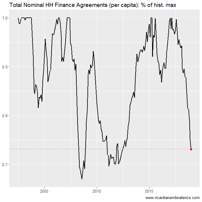 The below chart shows the current level as a percentage of the prior peak. So right now the flow of finance is ~73% of the Q1’17 peak (or equivalently is down ~27%).