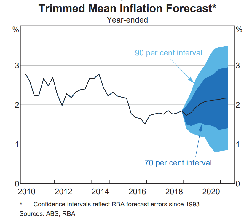 The last seven trimmed mean CPI prints have all rounded to 1.8%y/y. I think that’s very unlikely to remain true after today’s CPI print. The 0.6%q/q Q1’18 trimmed mean print will drop out of the base today, and I expect that it’ll be replaced with 0.4%q/q print (0.4%q/q is the average for H2’18). The RBA are expecting a high 0.4x%q/q print (rounding up to 0.5%q/q) which would take deliver ~1.75%