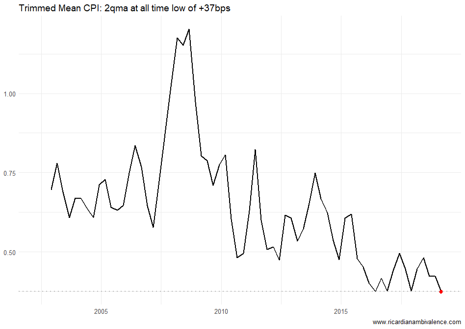 First of all, the very low inflation print cannot be dismissed as a once off. If you take the two-quarter average (as i have done in the above chart), trimmed mean CPI is at an all time low of 0.37%q/q. Given that growth is (at best) around trend, and that the unemployment rate has been stable at ~5% for two quarters, there is no reason to expect inflation to accelerate. Due to measurement issues, inflation is always overstated, so CPI at this level probably means that prices are flat — or perhaps falling a little.