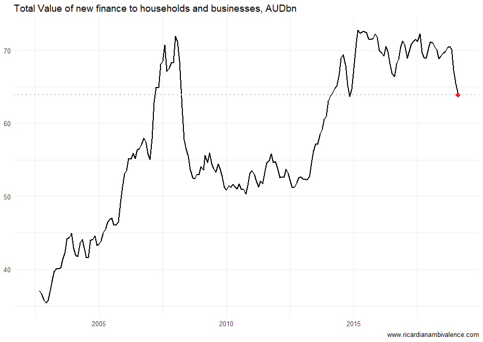 Does anyone think that’s still a barrier to rate cuts? The chart below shows the total value of new finance agreements (to households and firms, 3mma). As you can see, this has fallen sharply of late, and is now at the lowest level in 5 years (since 2014). If you adjust for the larger population / size of the economy this looks even weaker.