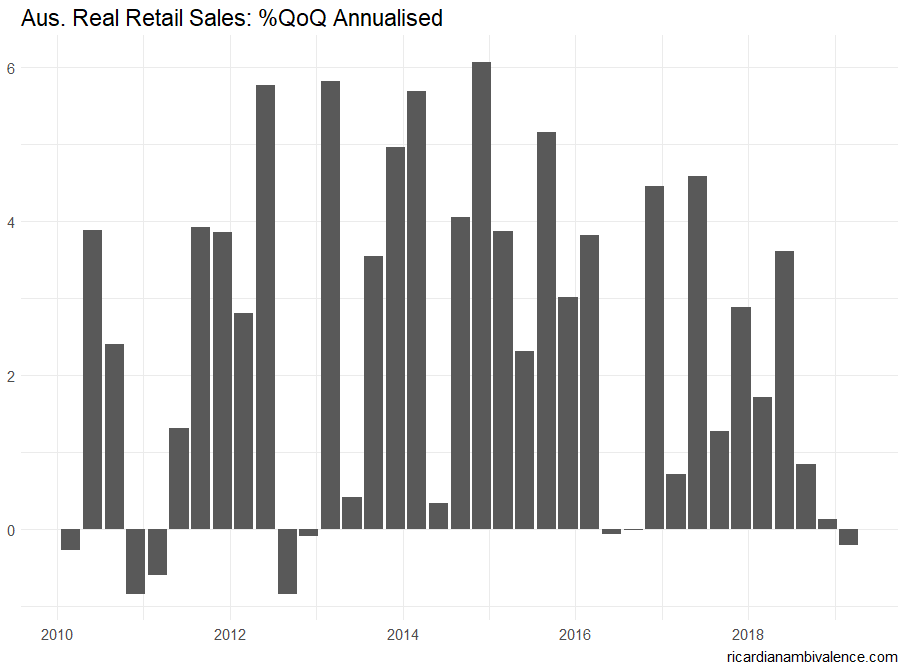 The prior weakness in housing and consumption has had most forecasters marking down their growth numbers — but I suppose that’s a problem for the RBA’s August meeting. The RBA trimmed only 25bps from their Dec’19 GDP forecast (to 2.75%) and left their Dec’20 GDP forecast unchanged at 2.75%. They’ll be lucky if growth is so strong. Today’s 10bps decline of real retail spending for Q1 (the third weak print in a row) suggests that the forces depressing H2’18 have carried over to H1’19.