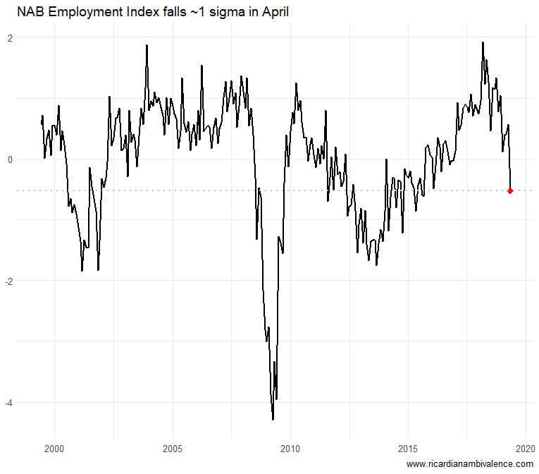 Their bull case appeared to fall apart today, with the NAB Employment index falling sharply to a below average level (-1 sigma to -0.5 sigma).