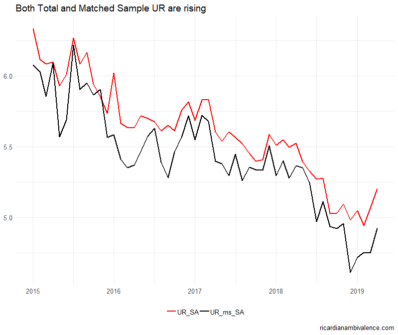 It’s tempting to blame sample rotation — as the incoming sample’s unemployment rate was 160bps higher than the sample it replaced — but i don’t think that’s right. The increase in the unemployment rate is actually larger if we exclude that new rotation group: the matched sample unemployment rate rose 18bps to 4.93%, which is a larger move than the 14bps increase in the total unemployment rate.