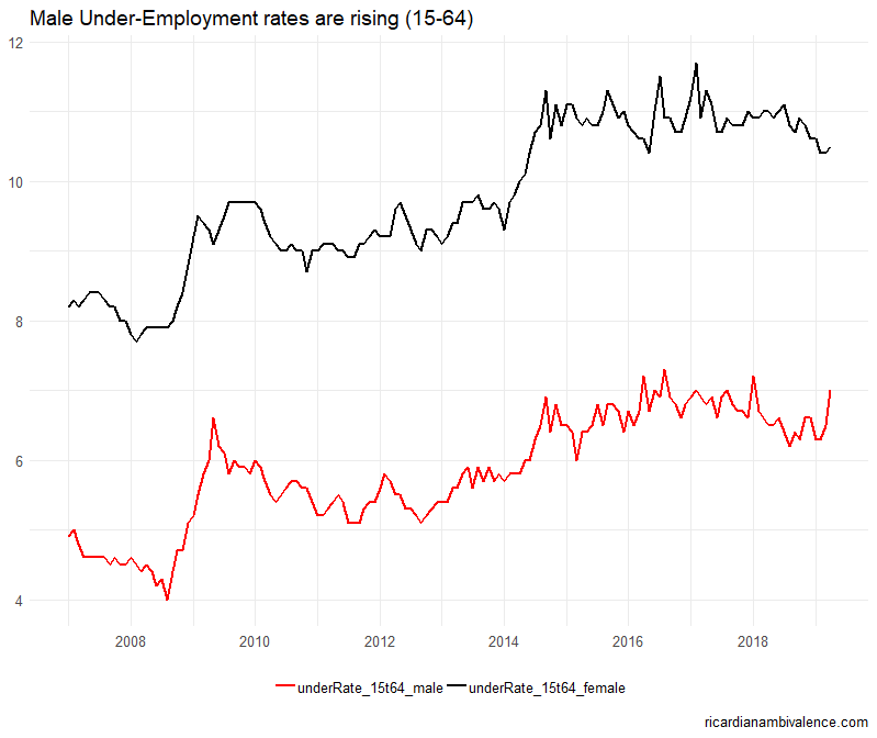 The details are consistent with what you’d expect in a cyclical downturn. Men tend to work in more cyclical industries, so in downturns you tend to see the male underemployment rates rise faster than female underemployment rates. That’s exactly what we are seeing: in April the prime male underemployment rate (15 to 64) rose 50bps to 7% and the female +10bps to 10.5%. The spread between the two has tightened ~100bps in the past six months (from ~450bps to ~350bps).