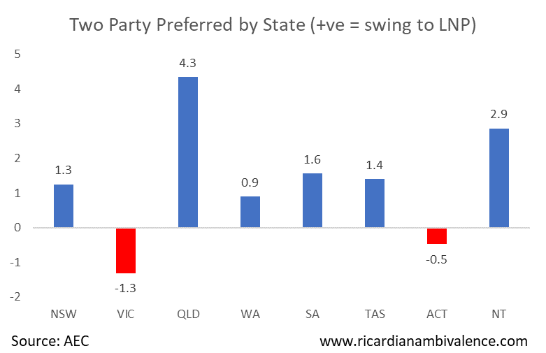 Also, note that this chart shows swings: keep in mind that the level of the LNP vote is higher in WA and Queensland, where there are more mines.