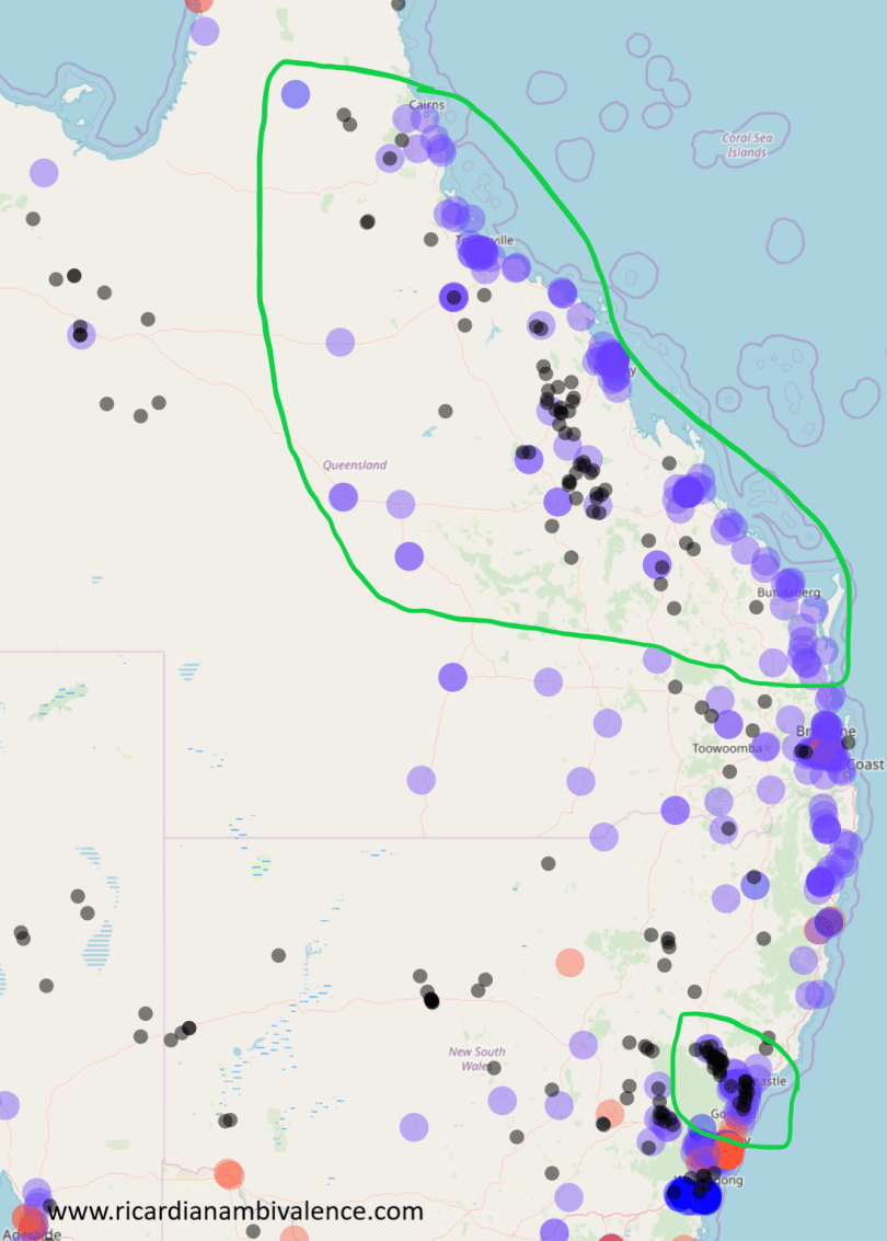 I think this chart does a reasonable job of highlighting the places where it went right for the Government. Queensland coal country is very blue. As is the north of Tasmania.