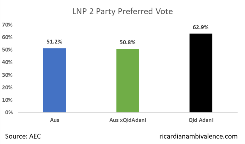 The LNP coalition holds 77 seats in a 150 seat house, and the Queensland seat of Herbert is prime Adani country (won 58.4% LNP v. 41.6% ALP, on an 8.4% swing to LNP). Without Herbert they would have only 76 seats — the bare majority needed to Govern in their own right. And the high primary vote in Queensland for the LNP meant they got three senators, which has greatly increased their power to make law in the Senate. The ALP’s slump meant they got only one senator from the six available in Queensland.