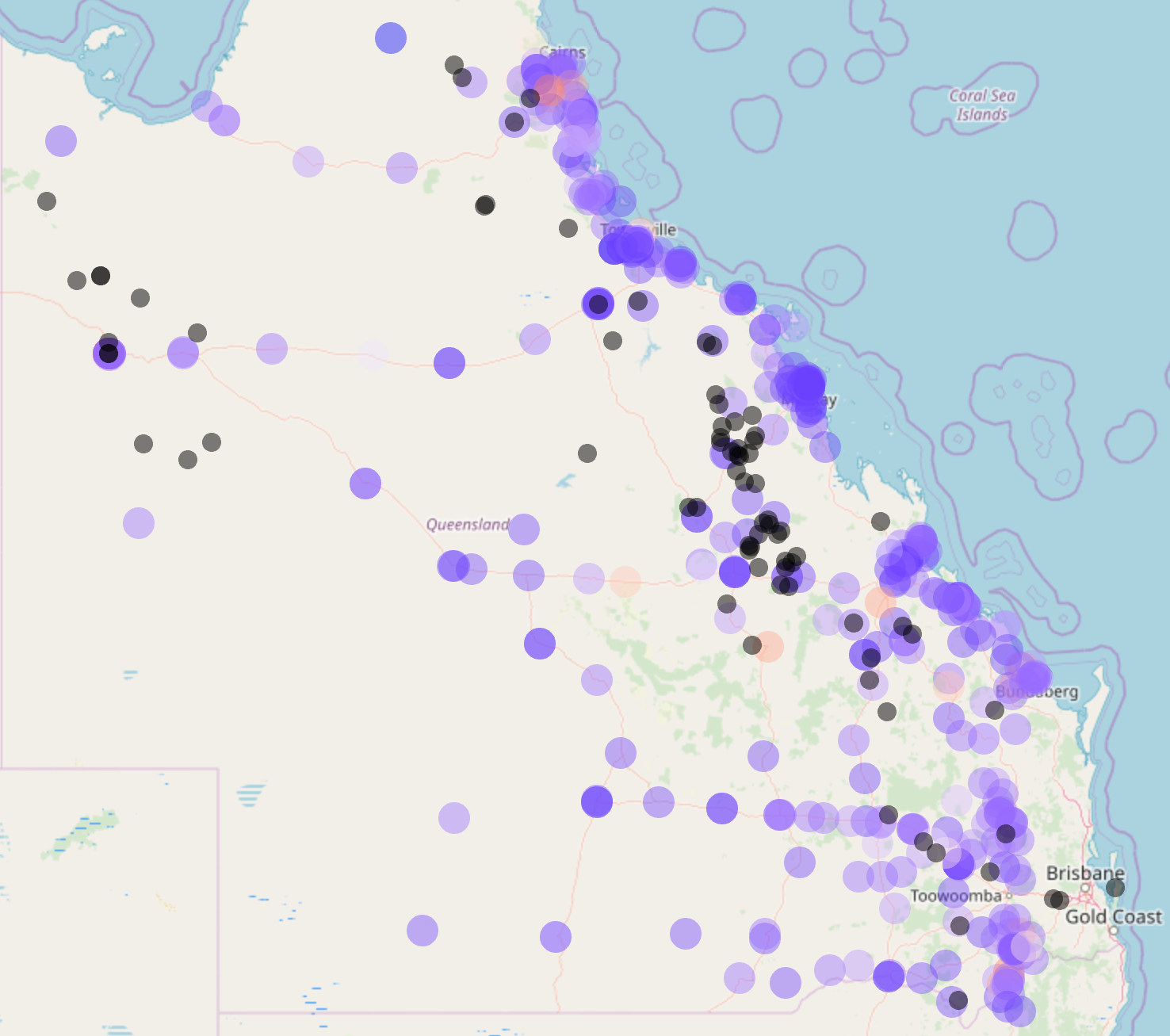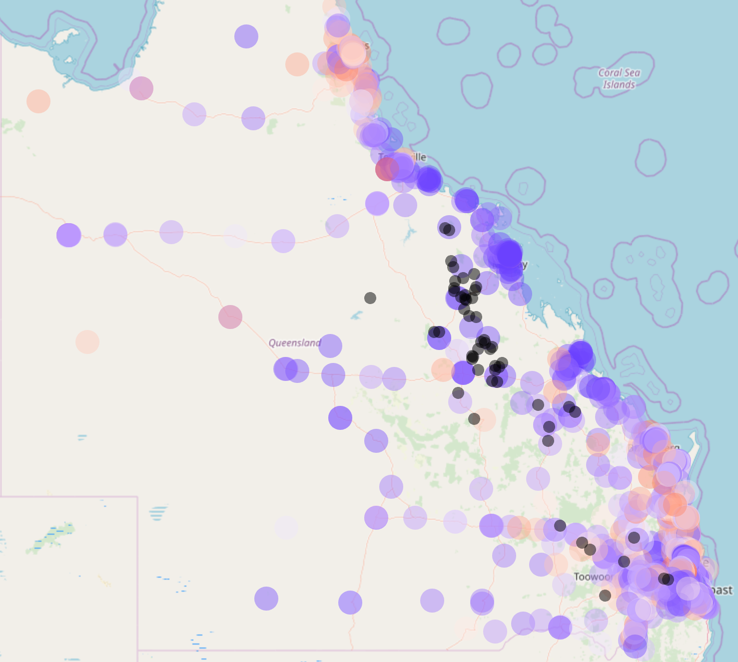 For the purpose of the above analysis, I selected all the seats have at least one booth that is less than 500kms from Adani (approx E 146.125, S -22). The seats are: Maranoa, Kennedy, Capricornia, Flynn, Dawson and Herbert. The two-party-preferred swing map is below (recall that blue = swing to LNP and red = swing to ALP). Again, it looks pretty good on the map: these booths all swung to the LNP.