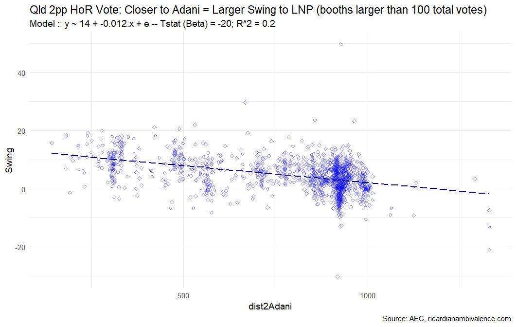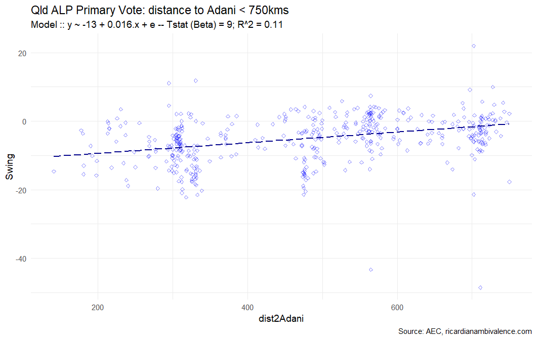 If we look at their primary vote (by booth) against the distance to the proposed Adani site, we find a very clear relationship. The closer a booth to the proposed Adani site, the greater the swing away from the ALP. Every 100kms further from the proposed Adani site, the ALP primary vote rises by 1.6ppts … until ~700kms from the mine the Qld swing looks a lot like the national swing.