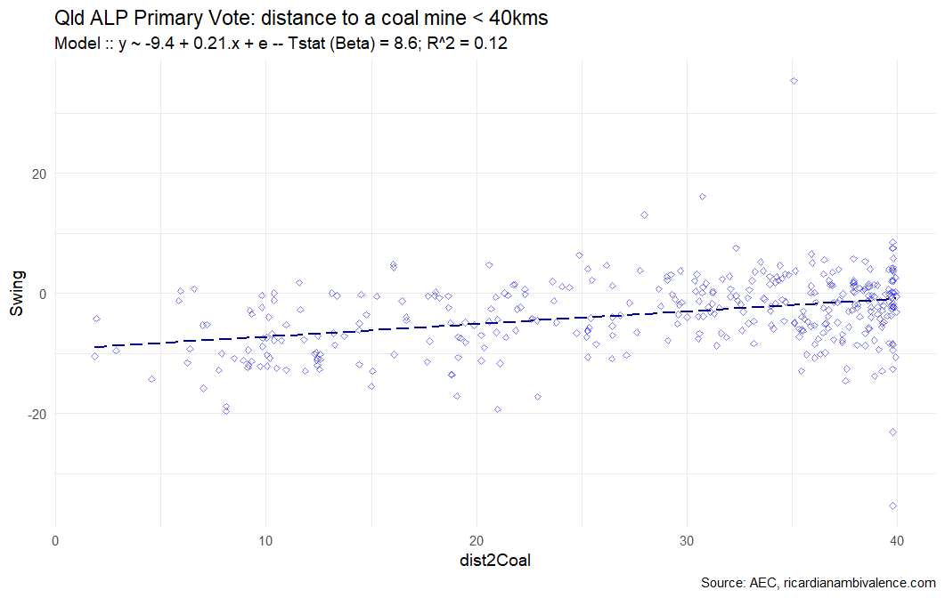 What about my hypothesis that it’s not just Adani, that it’s mines in general? That’s not so clear. It works (a bit), but most of the effect (in Qld) comes from coal mines. The nearer to coal mine (not just Adani, but any coal mine) the larger the swing away from the ALP.