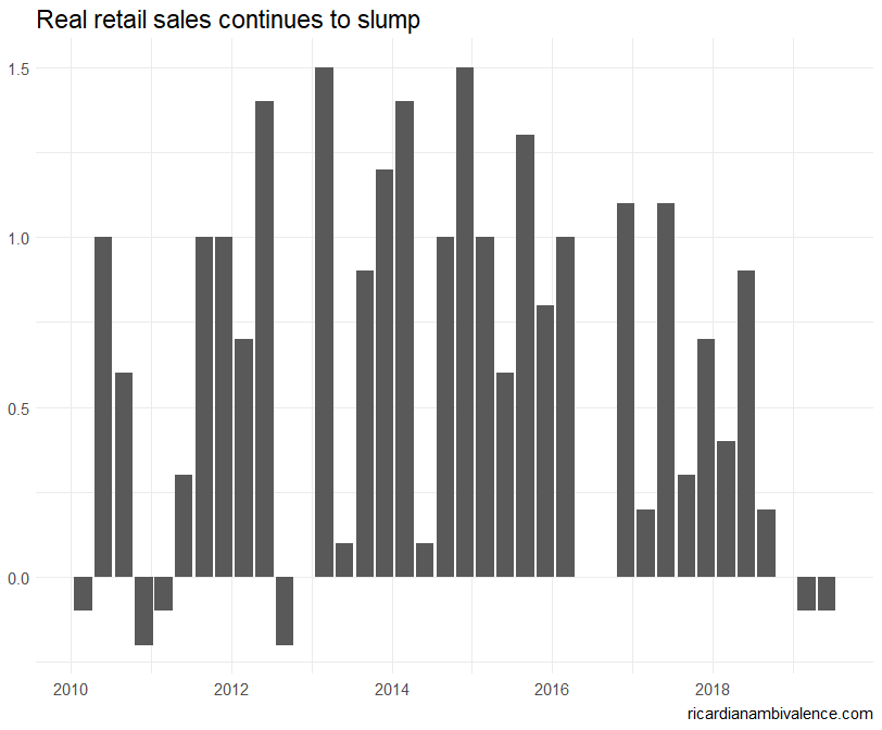 So that’ll be three quarters without any growth of real retail sales — despite a ‘strong’ labour market … what’s going on? Perhaps it’s a wealth effect?