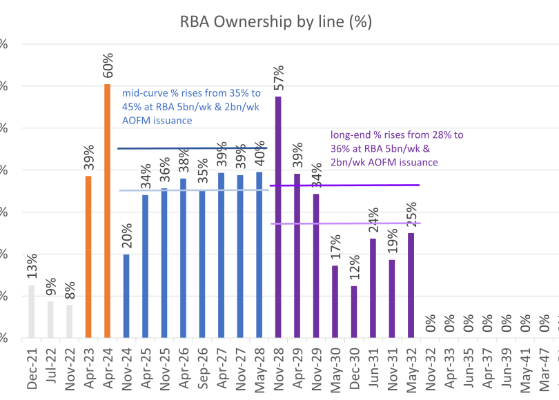 The problem with QE is that central banks can run out of bonds to buy. The design of the current QE package means that the RBA’s ownership of mid-curve bonds (the ones the RBA typically buys on Monday) may hit limits if QE goes for too long.