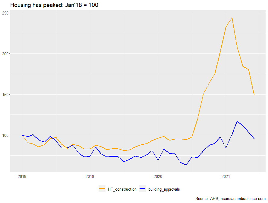 The bottom line is that we should expect the recovery from the Q3’21 lockdowns to be a little more subdued. The housing market is likely to be a headwind this time. Also, retailers report that people aren’t buying like they did in 2020 (they are lobbying for a return of JobKeeper).