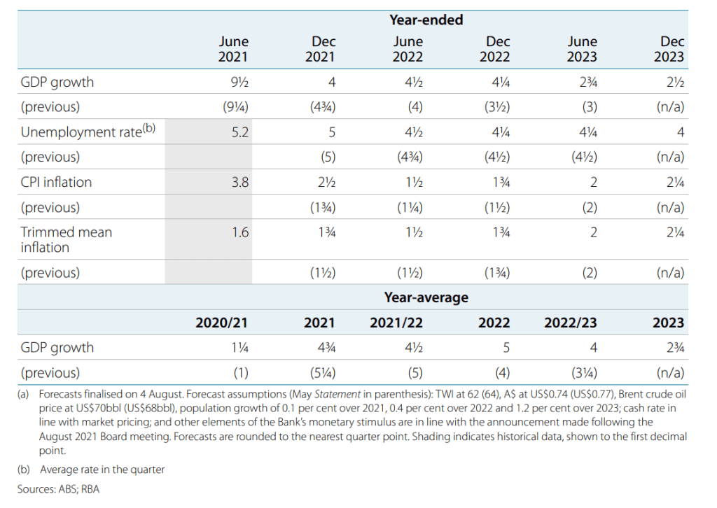 Still the Governor’s opening statement was basically a summary of the August SOMP, and those forecasts were (largely) set last week, so there was minimal wriggle room. The short summary of the August SOMP is that the RBA retained much of the upgrade they were looking at when they decided to taper bond buying (by 1bn per week to 4bn per week), but added a short-sharp contraction in Q3 due to the current lockdowns.