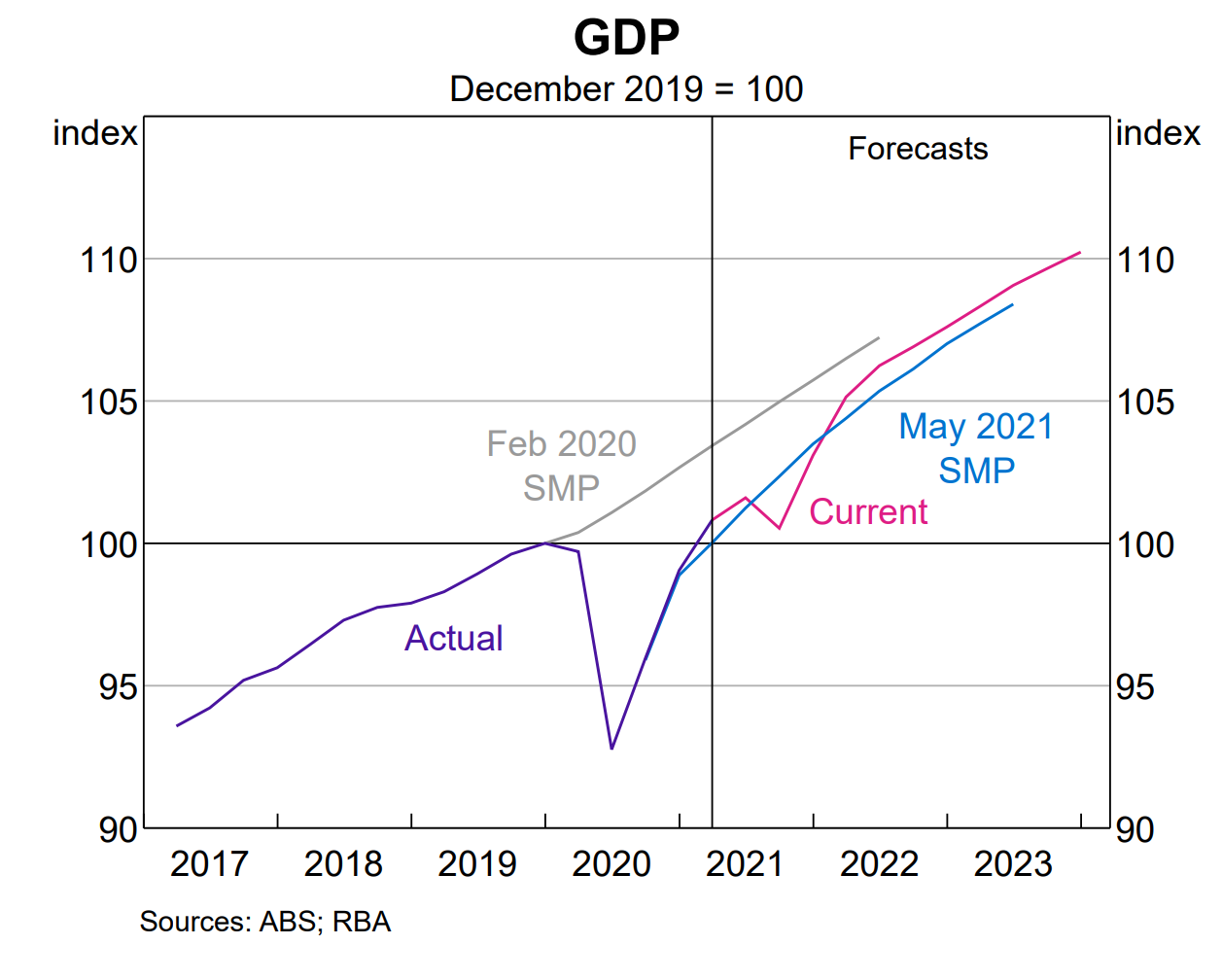 The upshot of all this is that the unemployment rate is a touch lower in 22/23 (by 25bps in both Q2’22 and Q2’23), and declines to 4% in Q4’23. The lower level of unemployment means that trimmed mean inflation is a bit higher. Trimmed mean inflation now hits 2% in mid-23 (it only rounded up to 2% in the May’21 SOMP, but was a touch below) and continues to rise to be a touch above 2% in Q4’23.