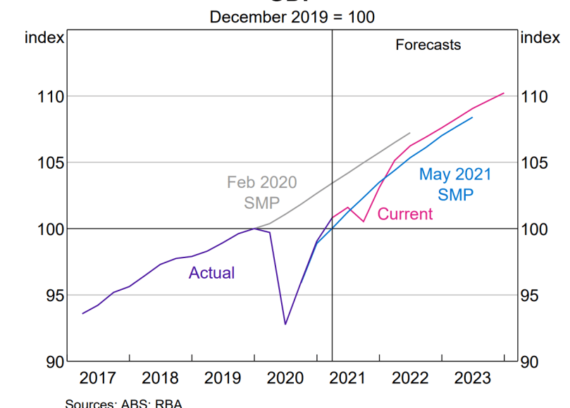This is the key reason that the RBA didn’t want to loosen monetary policy by deferring the tapering of their bond-purchase program (by 1bn/wk, to 4bn/wk) in August. As far as they are concerned, their forecasts are on track to hit their targets — which means that monetary policy is appropriately calibrated.