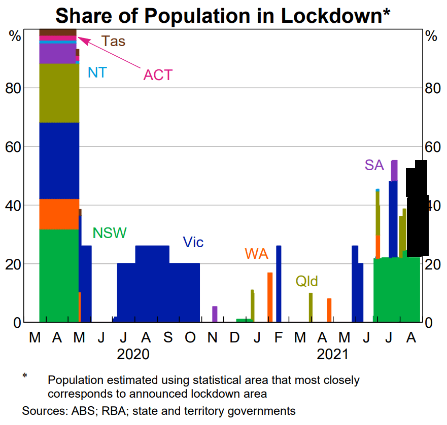 The SOMP included a nice chart showing the lockdowns to date. I’ve updated it (below) for the Melbourne, Brisbane & regional NSW lockdowns (Brisbane went in and out, regional NSW went in piecemeal until a snap 7 day lockdown of the entire state started on 15 August). It’s not supposed to be pretty (or 100% accurate) — it’s supposed to give you a feel for how much worse the situation has become in the last two weeks. It’s a little over twice as severe as the RBA expected.