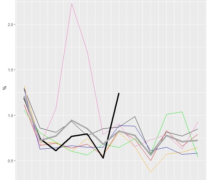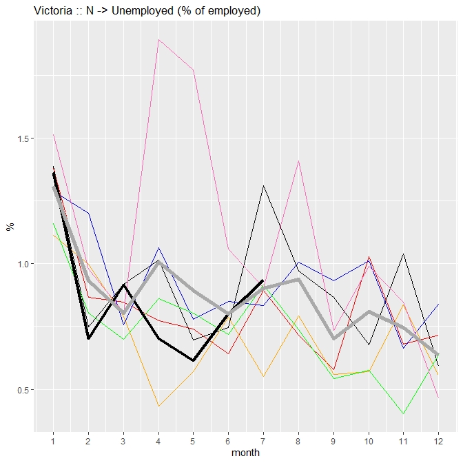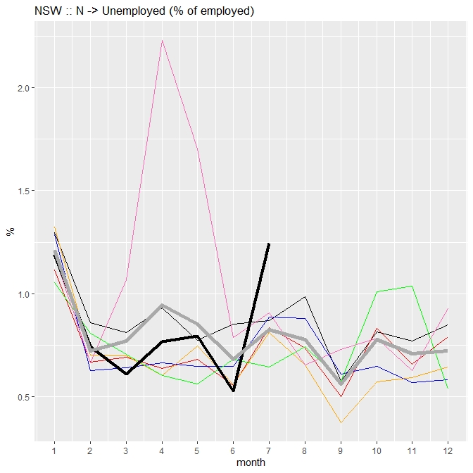 The chart below shows the percentage of those that were employed in June that transitioned to unemployed in July, for the state of NSW. You can see the percentage spiked to ~1.25%, which makes this by far the worst July in the past seven years. Only the COVID months in 2020 (the hot pink line) were notably worse. Note also that the black line (2021) has gone from below the grey line (grey is the average for 2015 to 2020) to above the grey line. So the NSW labour market has gone from better-than-average to markedly worse labour market conditions.