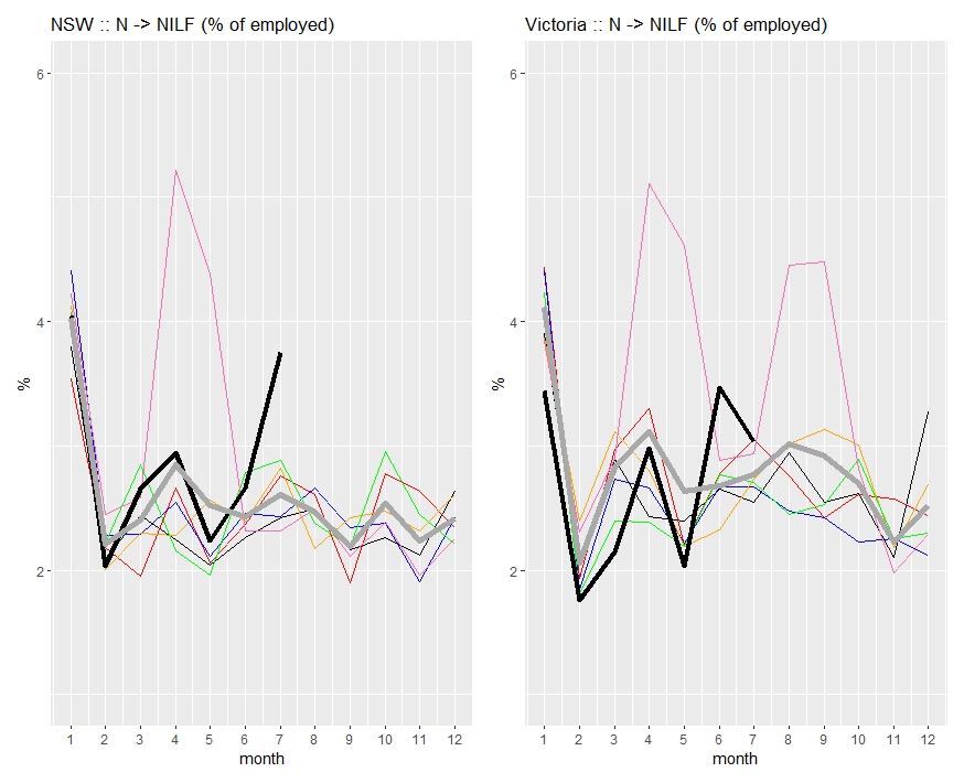 It cannot be dismissed as a difference in the propensity to search for work. The increase in transitions from Employment (N) to Not In the Labour Force (NILF) were similar, if a little higher, in NSW than was the case in the June Victorian lockdown.