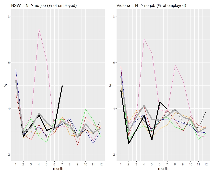 Combining these two transitions, we can see the proportion of people who had a job in June and didn’t have one in July. Again, you can see the spike in NSW, and that it’s different to what was happening in Victoria’s June lockdown. I don’t know why, but there’s something different going on in NSW.
