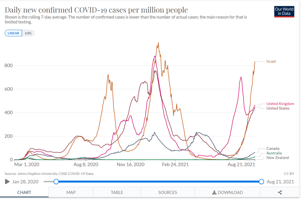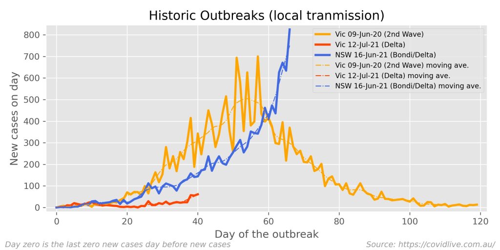Delta popped that bubble. We went from 2% of people locked down in in early August, to over 60% today (Victoria just locked down the entire state). And the NSW Premier is now urging the people of NSW to “stay calm” as case numbers make new higher-highs (despite lockdowns) each day. This outbreak is much worse than the second Victorian outbreak of 2020 (chart courtesy of Mark the Graph).