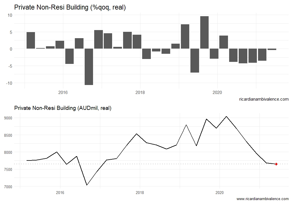 The ongoing decline of Private non-Resi building makes growth of Private Business Investment seem like a stretch. Private non-Resi building continued its decline in the Q2 CWD release, shrinking by another 0.4%qoq. Other components of Capex might offset (and at times the Capex measure is notably different to the CWD measure) — but the prospect of private business making up for the weakness in Dwelling construction seems dim.