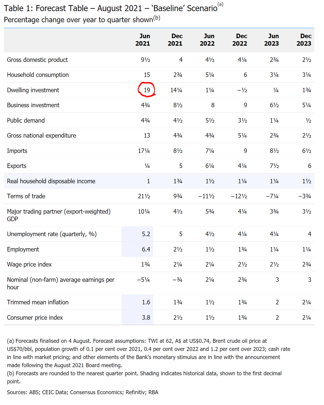 The RBA’s forecast of 9.5%yoy growth in Q2 equates to growth of around 0.75%qoq for Q2. Just under half of that 75bps of growth came from the assumption that Dwelling Investment would grow by about 5.5%qoq (Dwelling Investment growth of 5.5%qoq was required to hit 19%yoy). Private Dwelling investment is about 5.5% of GDP, so a 560bps miss (it fell 10bps in the Q2’21 CWD release yesterday) shaves 31bps off my tracking estimate of Q2 GDP (now 0.4%qoq).