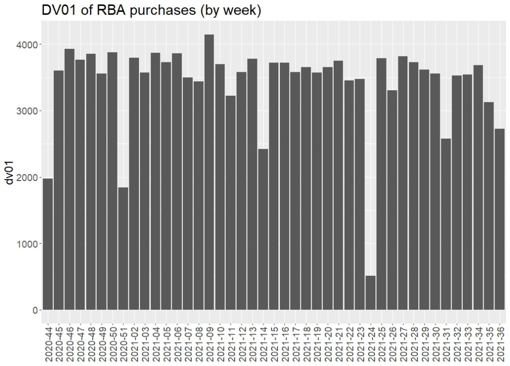 The problem has mostly been in the short OMOs. At the last few Auctions, the RBA has purchased a lot of shorter dated ACGBs. They have continued buying the longest bond in the short-BPP basket (the May’28, which is why the blue line remains flat), but in much smaller size. The skew to the shorter bonds has lowered the weighted average tenor and DV01 of the buybacks.