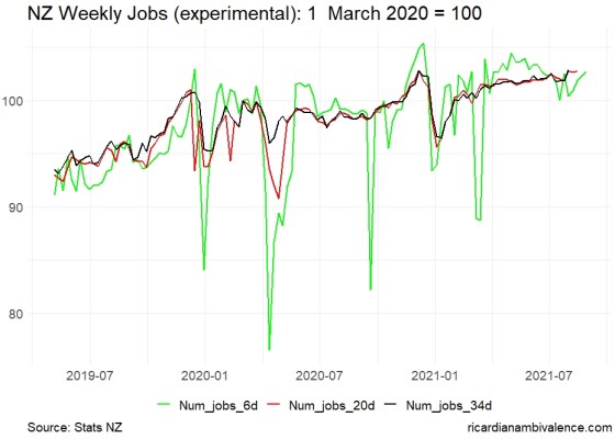 The weekly 6-day jobs series is now available up to the week ending 29-August. It suggests little damage from Delta, clearing the path for an RBNZ hike on 6 Oct.