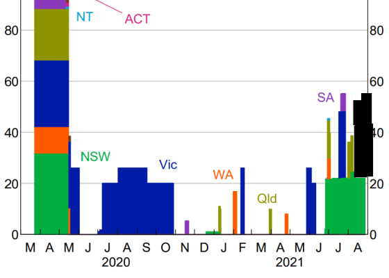 The lockdown situation is twice as bad as the RBA had in their August SOMP. Using Gov Lowe’s rule of thumb that consumption falls 15%, a Q3’21 GDP forecast of around -3% seems plausible (v. RBA -1% in the Q3 SOMP). The probability that the taper is dropped in Sep is rising.